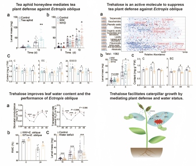 近日,我所茶樹遺傳育種創新團隊在茶樹介導的植食性昆蟲互作機理解析方面取得重要進展,首次鑒定了茶蚜蜜露中的海藻糖是調控茶蚜-茶樹-茶尺蠖三重互作關系的關鍵活性分子...??