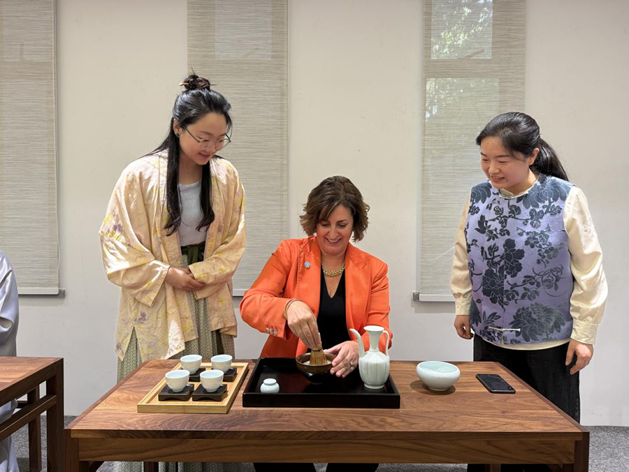 During her visit to the China Tea Science Society, Bechdol tried her hand at tea whisking, a featured tea-drinking art from the Song Dynasty of China, and made a cup of tea rich in foam. Later, she visited the labs and facilities of the institute and learned about latest research progress in sensory evaluation of tea, and biological pest prevention and control for tea plants.