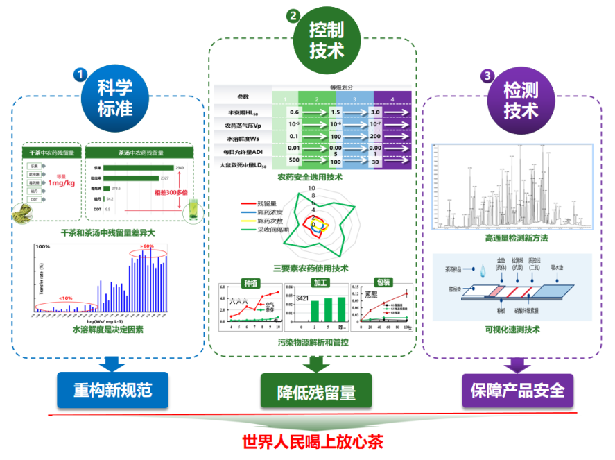 針對(duì)國(guó)際茶葉最大殘留限量(MRLs)不合理,殘留量階段性發(fā)生嚴(yán)重,檢測(cè)方法靈敏度低等問題,首次提出茶湯“有效風(fēng)險(xiǎn)量”決定原則,重構(gòu)了茶葉中MRLs制定的國(guó)際規(guī)范;研發(fā)了茶園農(nóng)藥安全選用、合理使用和污染物源控制的殘留控制技術(shù);突破現(xiàn)場(chǎng)快速檢測(cè)和高通量精準(zhǔn)檢測(cè)難點(diǎn),研發(fā)出490種化學(xué)品檢測(cè)技術(shù),吡蟲啉、啶蟲脒等速技術(shù)和產(chǎn)品;研制出54項(xiàng)國(guó)內(nèi)外標(biāo)準(zhǔn),構(gòu)建了“MRLs制定、殘留控制、識(shí)別檢測(cè)” 為核心技術(shù)的管控體系,顯著提高了我國(guó)茶葉質(zhì)量安全水平。該成果獲2019年度國(guó)家科學(xué)技術(shù)進(jìn)步二等獎(jiǎng)。