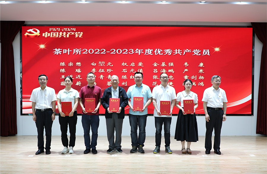 表彰儀式上,黨委委員任淑敏同志通報(bào)了2023年度研究所、部門(團(tuán)隊(duì))、個(gè)人獲上級(jí)榮譽(yù)表彰情況,黨委委員姚明哲同志宣讀了茶葉所2022-2023年度“兩優(yōu)一先”表彰決定,所長姜仁華、黨委書記江用文共同為獲獎(jiǎng)代表頒獎(jiǎng)。最后,6名新黨員以及全體與會(huì)黨員面向黨旗宣誓,集體重溫了入黨誓詞。