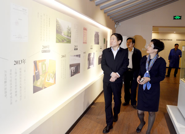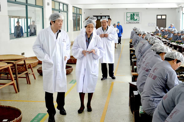 正值茶季,徐部長(zhǎng)一行還饒有興致地參觀了龍井茶炒制車間,龍冠公司姜愛芹總經(jīng)理匯報(bào)了公司的生產(chǎn)情況。