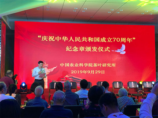 9月29日下午,我所隆重舉行“慶祝中華人民共和國成立70周年”紀念章頒發儀式,會議由副所長魯成銀主持。所黨委書記姜仁華同志,中國國際茶文化研究會常務副會長、杭州市人民政府原市長孫忠煥先生頒發紀念章,并向紀念章獲得者表示熱烈祝賀和崇高敬意。所領導,特邀嘉賓及全所職工、離退休老同志近300人參加頒發儀式。