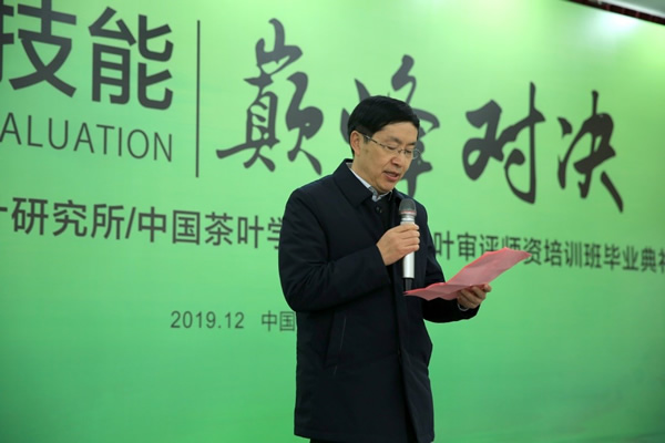 典禮上,我所副所長魯成銀研究員致辭。他表示,學員們在這一年里跟隨50余名專家老師系統學習了茶學、制茶學、食品感官等專業知識,分專題對六大茶類和再加工茶類800多只茶樣進行感官審評技能強化和加工實訓,理論結合實踐,提升了茶學專業水平、審評技能及傳播技巧等綜合能力,拓寬了眼界、啟迪了思路,望各位學員傳承技能、傳播文化,推動我國茶產業發展。
