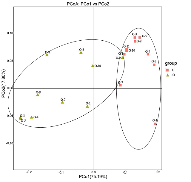 圖1.基于20個茶尺蠖兩近緣種樣本共生菌OUTs的主成份分析。黃色樣點代表小茶尺蠖,紅色樣點代表灰茶尺蛾。
