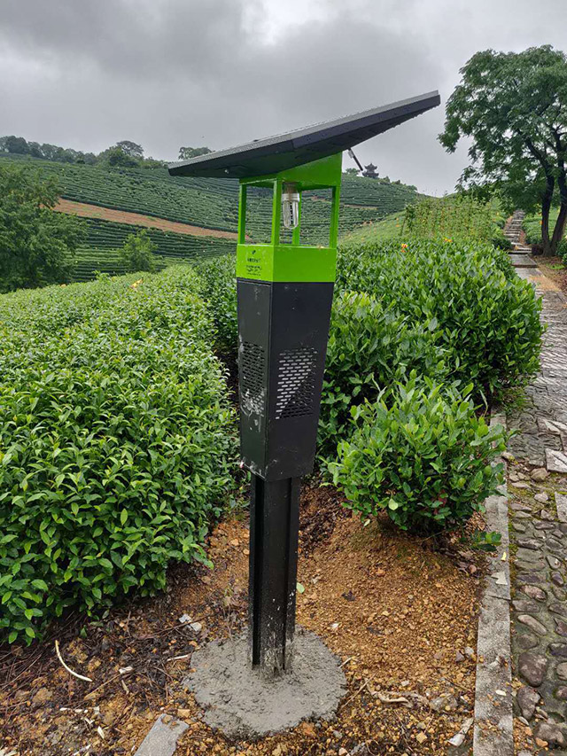 “這些像路燈一樣的設(shè)備叫天敵友好型太陽能殺蟲燈,是中國農(nóng)業(yè)科學(xué)院茶葉研究所陳宗懋院士團隊研發(fā)的。我們在茶園內(nèi)連片規(guī)模化安裝了550盞天敵友好型殺蟲燈,每20畝1盞,首期覆蓋1.1萬畝茶園。”西湖區(qū)農(nóng)業(yè)技術(shù)推廣服務(wù)中心工作人員介紹,天敵友好型太陽能殺蟲燈利用害蟲與天敵的趨光特性差異,發(fā)射光譜僅有8nm寬,在誘殺茶尺蠖、茶小綠葉蟬等茶園害蟲的同時,能最大程度地減少對天敵(益蟲)的誤殺,有效提高茶園害蟲殺滅效率。同時,它還搭建起物聯(lián)網(wǎng),接入GIS(地理信息系統(tǒng))地圖,將所有殺蟲燈接入到控制平臺,狀態(tài)實時更新,手機實時監(jiān)控,實現(xiàn)遠程操控,開啟西湖茶園智能化時代。