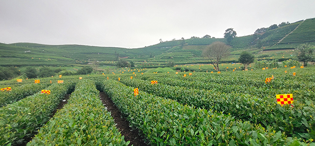 茶園內(nèi)紅黃相間的粘蟲色板 來源:西湖區(qū)農(nóng)業(yè)農(nóng)村局