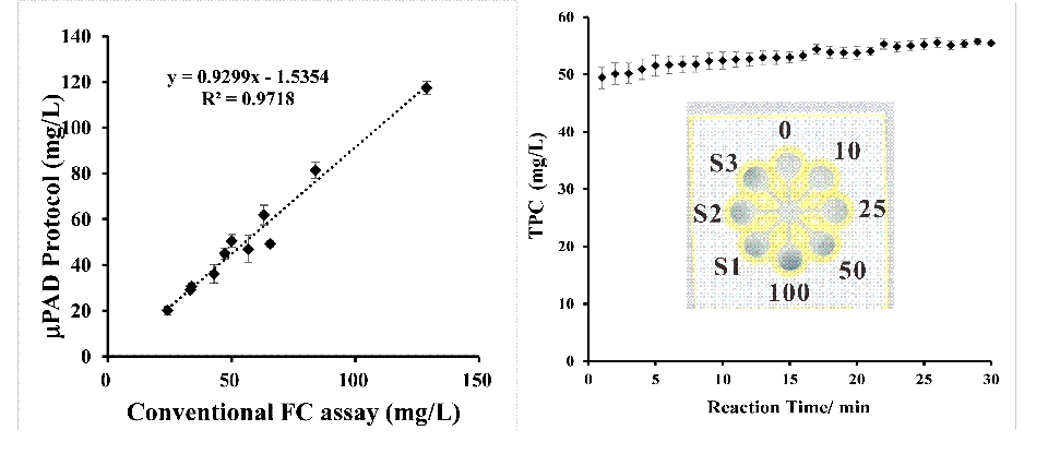 茶多酚含量快速檢測效果。左:本方法與傳統(tǒng)檢測方法數(shù)據(jù)結(jié)果吻合良好;右:新方法可在任意時(shí)間進(jìn)行檢測(檢測時(shí)間對(duì)結(jié)果無明顯影響)。