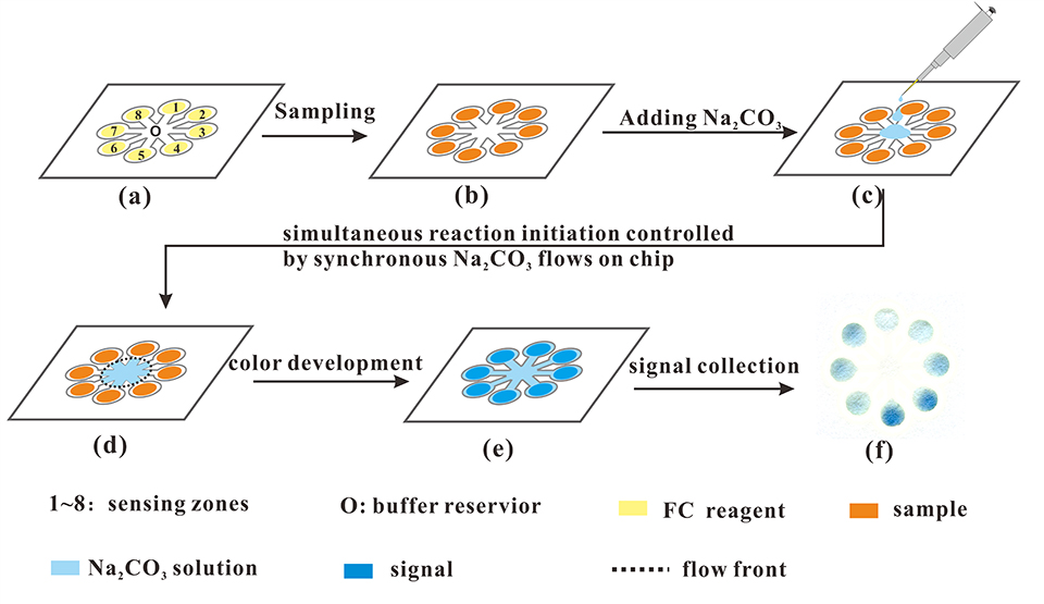 茶多酚是決定茶葉滋味及保健功效的主要成分。傳統(tǒng)茶多酚含量測定以福林酚顯色反應(yīng)為基礎(chǔ),但由于福林酚試劑與茶多酚的反應(yīng)本身非常緩慢,需要2小時(shí)左右才能達(dá)到穩(wěn)定狀態(tài),因而傳統(tǒng)茶多酚含量檢測方法存在操作復(fù)雜、耗時(shí)、試劑消耗大以及成本高等缺陷。微流控紙芯片技術(shù)具有高通量液流操控的特殊功能,可實(shí)現(xiàn)對(duì)平行反應(yīng)的精確控制,結(jié)合動(dòng)力學(xué)匹配方法,在10分鐘內(nèi)即可完成茶多酚含量的準(zhǔn)確測定。與傳統(tǒng)方法相比,本方法在顯著縮短檢測時(shí)間的同時(shí),還具有節(jié)約試劑、裝置簡單的優(yōu)勢,在茶葉生產(chǎn)實(shí)時(shí)監(jiān)控、消費(fèi)者自測等方面具有良好的應(yīng)用前景。
