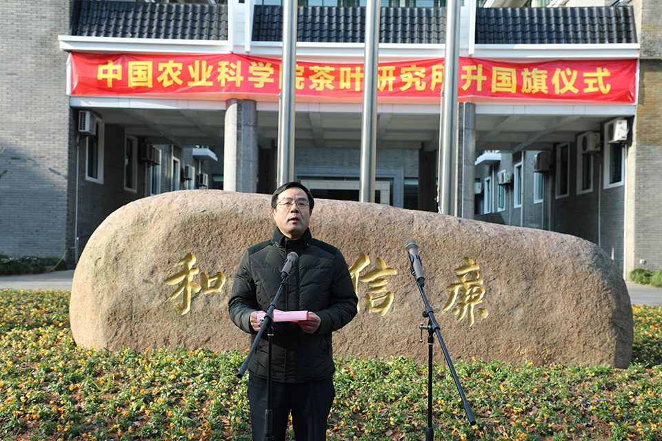 儀式后,姜仁華所長(zhǎng)、書記作了講話。他指出,即將過去的2020年,是中華民族歷史上極不平凡的一年。以習(xí)近平同志為核心的黨中央不忘初心、牢記使命,團(tuán)結(jié)帶領(lǐng)全黨全國各族人民砥礪前行、開拓創(chuàng)新,在這極不尋常的年份交出了一份人民滿意、世界矚目、可以載入史冊(cè)的優(yōu)秀答卷。他表示,國旗是國家的象征和標(biāo)志,舉行升掛國旗儀式,就是要大力弘揚(yáng)愛國主義精神,讓愛黨、愛國、愛人民成為每一個(gè)茶科人的堅(jiān)定信念和精神追求;就是要大力弘揚(yáng)科學(xué)家精神、勞動(dòng)精神、勞模精神、工匠精神,以科學(xué)、嚴(yán)謹(jǐn)、務(wù)實(shí)的工作作風(fēng),共創(chuàng)茶葉所更加美好的明天。最后,他勉勵(lì)全所職工,在新的一年里,以勇于擔(dān)當(dāng)、奮發(fā)有為的精神狀態(tài),開拓創(chuàng)新、腳踏實(shí)地的工作作風(fēng),共同譜寫研究所發(fā)展新的篇章,以更加優(yōu)異的成績(jī)向建黨100周年獻(xiàn)禮。
