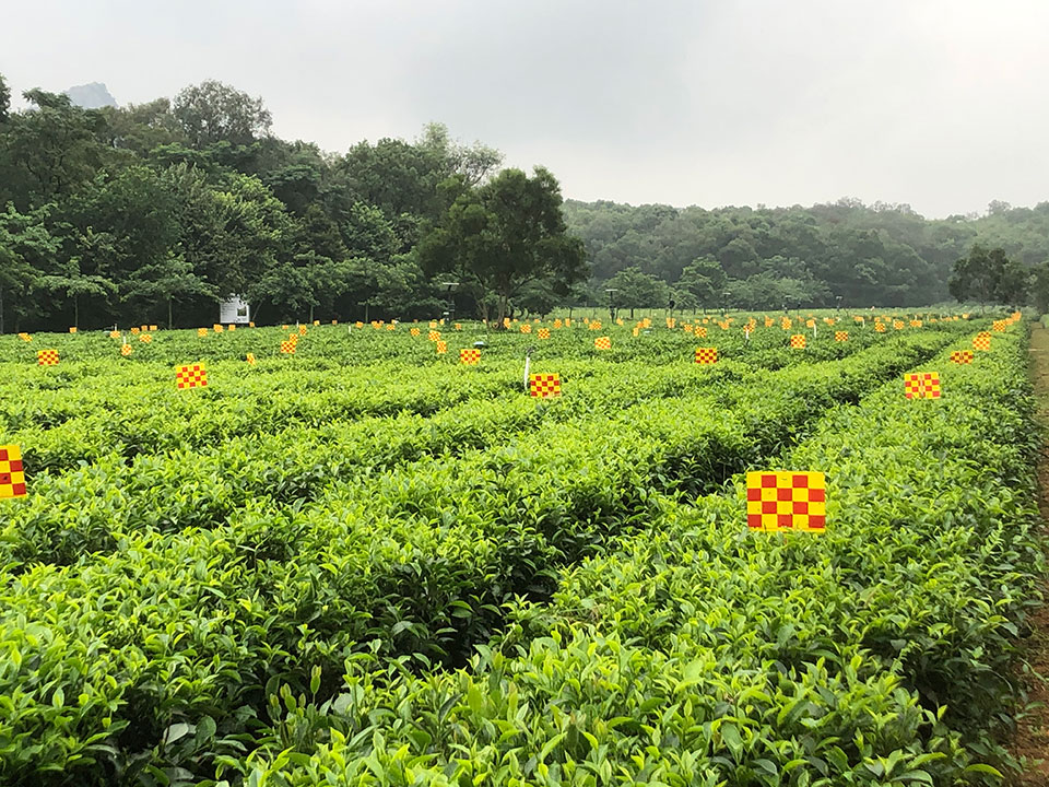 2010年前后,陳宗懋團(tuán)隊(duì)發(fā)現(xiàn)我國(guó)茶園常用的黃色粘蟲板顏色差異大,缺乏靶標(biāo)針對(duì)性,不同產(chǎn)品的誘殺效果參差不齊。他提出通過可數(shù)字化的顏色篩選茶小綠葉蟬最佳誘捕色,研發(fā)出了茶小綠葉蟬、茶棍薊馬等害蟲的數(shù)字化色板,并獲中國(guó)專利優(yōu)秀獎(jiǎng)。經(jīng)過大面積應(yīng)用之后,數(shù)字化單色板暴露出“殺敵一千自損八百”的缺點(diǎn),在使用過程中會(huì)殺傷一定數(shù)量的天敵昆蟲。為了解決這個(gè)問題,陳宗懋團(tuán)隊(duì)又從昆蟲視覺生理出發(fā),創(chuàng)制出天敵友好型雙色誘蟲板,降低了40%的天敵誤殺量。