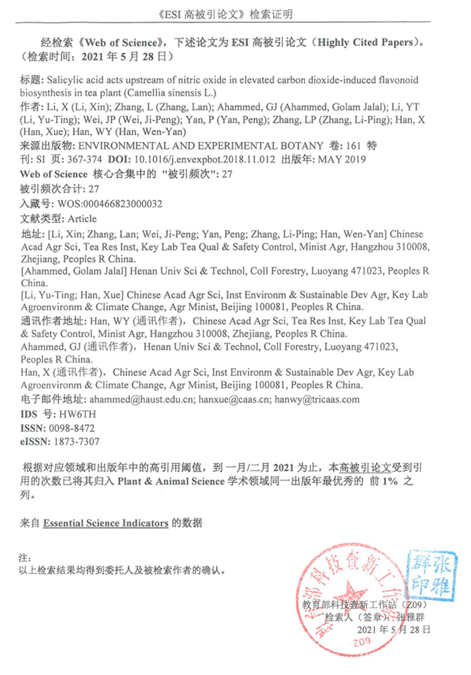 “Salicylic acid acts upstream of nitric oxide in elevated carbon dioxide-induced flavonoid biosynthesis in tea plant(Camellia sinensis L.)”,自2019年在Environmental and Experimental Botany上發(fā)表至今,被引用次數(shù)已達(dá)27次(Web of Science數(shù)據(jù)統(tǒng)計(jì))。韓文炎研究員為該論文的通訊作者。論文揭示了水楊酸和一氧化氮信號(hào)參與了二氧化碳濃度升高環(huán)境下茶樹(shù)類(lèi)黃酮代謝的調(diào)控,為氣候變化環(huán)境下茶樹(shù)品質(zhì)代謝調(diào)控提供了理論依據(jù)。