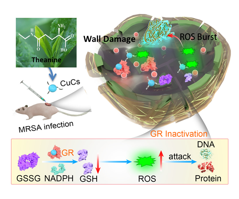 耐甲氧西林金黃色葡萄球菌(MRSA)是臨床上常見的多重耐藥菌。臨床上治療MRSA感染的一線用藥是萬古霉素,但研究者們已經分離出對萬古霉素耐藥的MRSA菌株,針對MRSA開發新型抗菌劑迫在眉睫。為解決這個難題,他利用茶樹中天然活性分子茶氨酸為結構單元,設計功能多肽構建了具有精確分子組成的茶氨酸銅團簇,能夠高效地殺傷多重耐藥菌MRSA,并且對MRSA引起的小鼠皮膚感染和敗血癥感染有良好的治療作用,其治療效果與臨床用藥莫匹羅星和萬古霉素相當。此外,憑借茶氨酸良好的生物相容性和安全性,茶氨酸銅團簇對哺乳動物細胞具有良好的細胞安全性,且在殺菌濃度下不會引起溶血效應。相關研究成果發表在國際化學及材料科學著名期刊Advanced Functional Materials上。他所在團隊在國際上首次提出并初步證明了“茶氨酸金屬團簇可以通過直接抑制細菌內GR活性來導致ROS升高,最終導致細菌死亡”這一假說。研究結果不僅為茶葉次生代謝物在新型醫用材料的構建及生命醫藥領域中的應用開辟了新方向,也為新型醫用材料的抗菌機制研究提供了新方法。