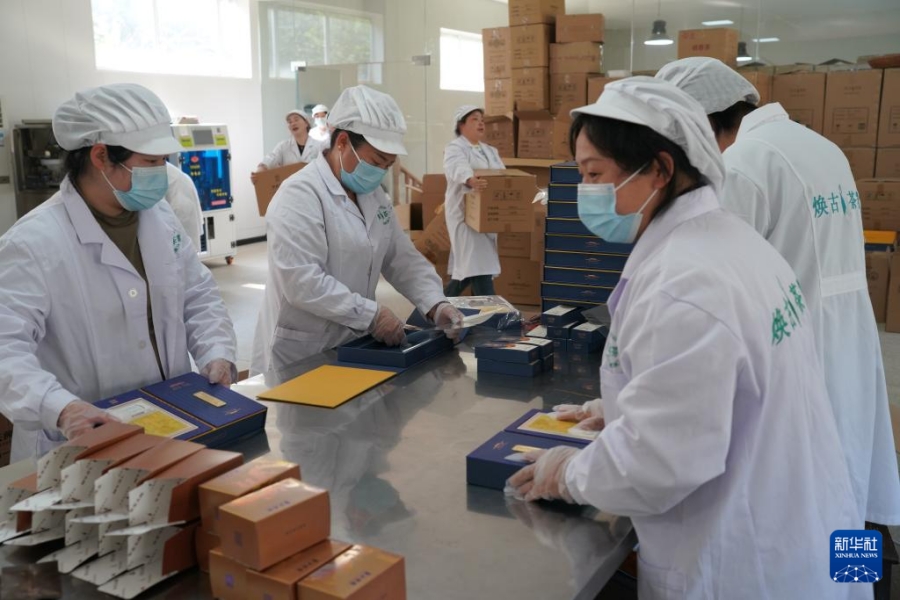 ?3月26日,紫陽縣煥古鎮一茶企工作人員在生產車間內包裝茶葉。