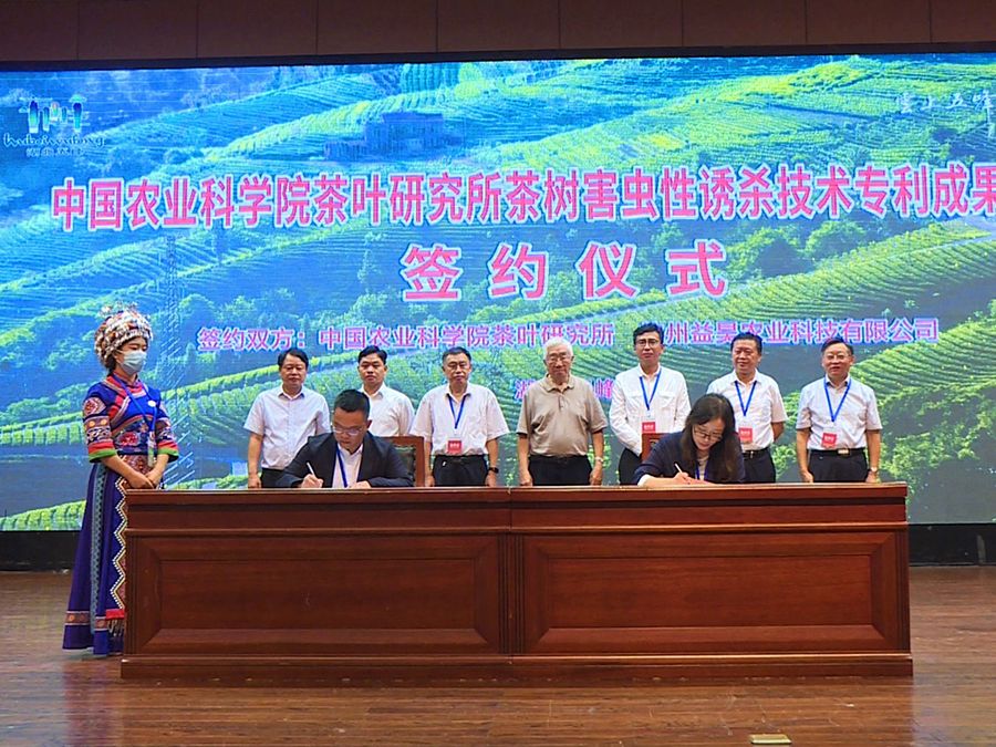 現(xiàn)場(chǎng)觀摩結(jié)束后,舉行了專(zhuān)利成果轉(zhuǎn)化簽約儀式。陳宗懋院士團(tuán)隊(duì)發(fā)明的“一種灰茶尺蛾雄蟲(chóng)性誘劑及含該性誘劑的誘芯制備方法”專(zhuān)利以獨(dú)占許可的方式授權(quán)杭州益昊農(nóng)業(yè)科技有限公司成果轉(zhuǎn)化,簽約金額突破一千萬(wàn)元,是我國(guó)茶樹(shù)植保領(lǐng)域知識(shí)產(chǎn)權(quán)創(chuàng)造和運(yùn)用工作的新突破。