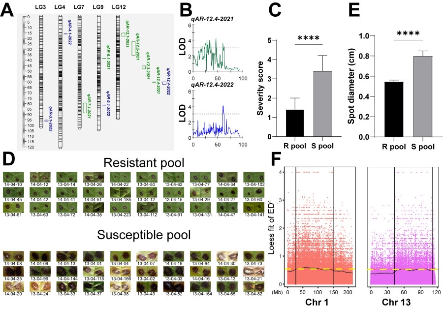研究人員通過田間調查發現茶樹‘龍井43’ב白雞冠’雜交F1代對炭疽病存在明顯抗性差異。隨后基于連鎖分析發現一個主效QTL(qAR-12.4)在兩年分別可以解釋10.8%和12.7%的表型變異;進一步通過混池測序定位了兩個基因組區段與炭疽病抗性具有很強的相關性:位于1號染色體的qARChr1和13號染色體的qARChr13。對親本‘龍井43’和‘白雞冠’在接種山茶炭疽菌0、24和48小時后的葉片分別進行轉錄組測序,結果顯示位于qARChr1區段內的核定位ERF轉錄因子(CsERF105)表達水平在‘白雞冠’葉片接種后逐漸提高,而在‘龍井43’中則沒有該趨勢。進一步通過對‘白雞冠’進行CsERF105反義寡核苷酸處理,發現其炭疽病抗性顯著降低,表明CsERF105可能是一個影響炭疽病抗性的正調控因子,研究初步明確了茶樹抗炭疽病的遺傳位點,并為后續的分子育種提供了理論依據。