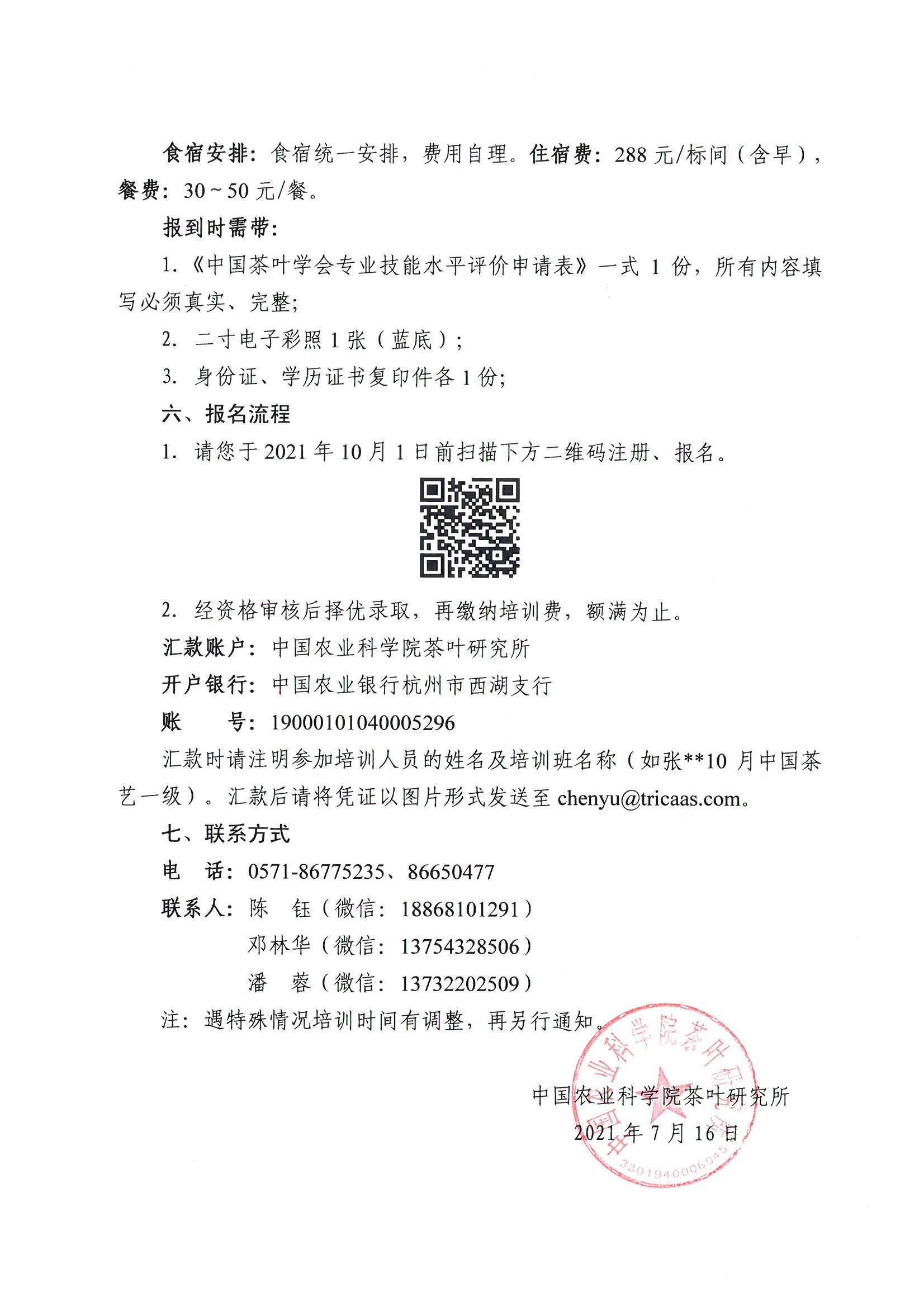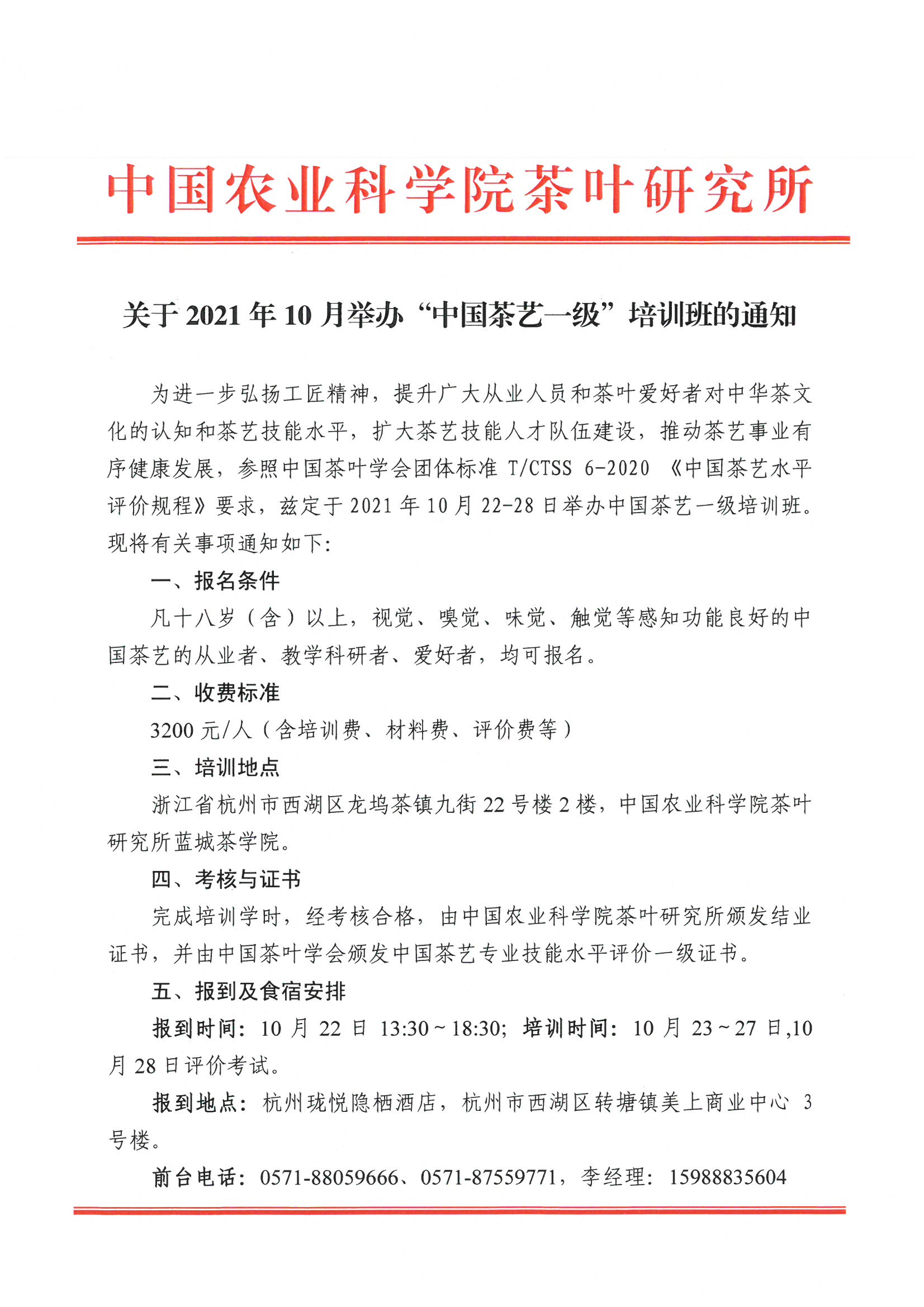 中國農業科學院茶葉研究所關于2021年10月22-28日舉辦中國茶藝一級培訓班的通知